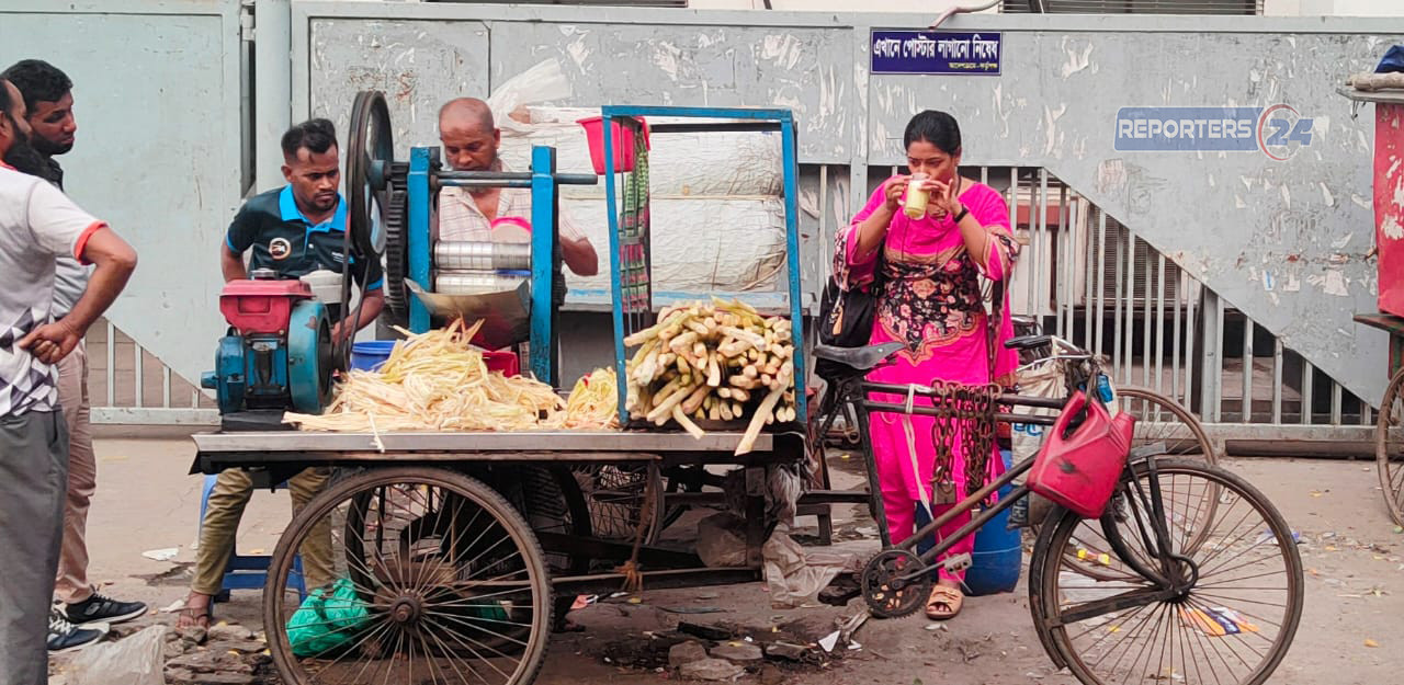 ঢাকায় চলমান দাবদাহ এবং অতিরিক্ত আর্দ্রতার কারণে সাধারণ মানুষের জীবনযাত্রা বিপর্যস্ত হয়ে পড়েছে। এমন পরিস্থিতিতে আখের রসের চাহিদা বেড়েছে। ছবি: আবু সুফিয়ান রতন।